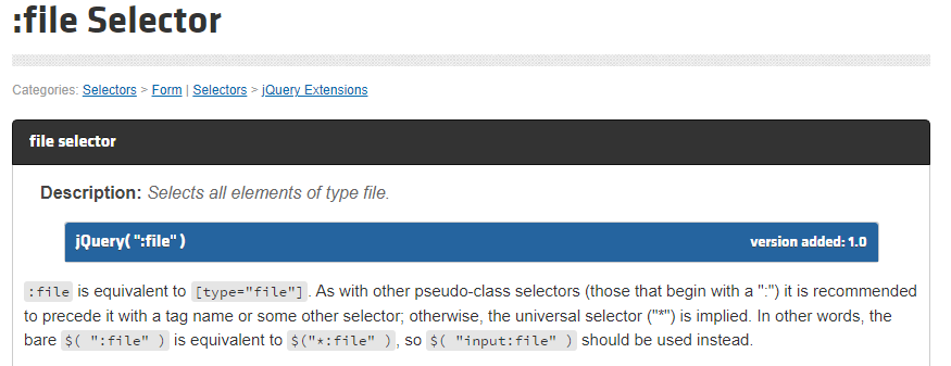 jQuery API문서를 보면서 계속 나를 신경쓰이게 하는 것이 있어서 검색을 좀 해 보았다. 1. 무엇 이미지의 설명 중에서 「pseudo-class selectors(thos that begin with a ":"」부분이다. 출처 : https://api.jquery.com/file-selector/ 2. 내용 pseudo-class는 요소(element)의 특별한 상태를 정의하는 데 사용한다고 한다. 태그로 예를 들면, a:link, a:visited, a:hover ...와 같이 사용한다고 할 때 [:link], [:visited], [:hover]을 의미한다. ※ 자세한 내용은 「3. Reference」를 참고하시기 바랍니다. 3. Reference Thank you, www.w3schools...