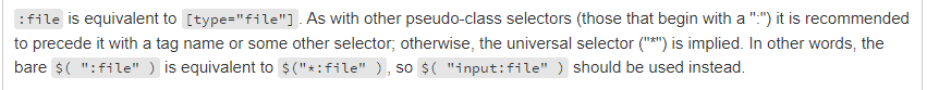 원문 : https://api.jquery.com/file-selector/ 1. 무엇 ("*")은 모든 요소들을 선택하는 universal selector이다. $(":checkbox"), $(":file"), $(":disabled"), $(":enabled") ... 처럼 사용하는 것은 ":"로 시작하는 Selector들은 $("*:checkbox"), $("*:file"), $("*:disabled"), $("*:enabled")과 같은 의미이다. 2. 어떻게 모든 요소들의 검색을 피하려면, $("input:checkbox"), $("input:file"), $("div[name='container'] :enabled")와 같이 선행하는 Selector와 조합해서 사용해야 한다.